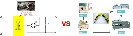 比如设计开发一个市电交流输入转直流输出的,很多人的第一时间就想到采用工频变换电路方案,因为此方案比较简单,一个工频变压器,再加上个整流滤波就可以搞定,如下图6所示。使用此方案的产品的效率非常低,并且产品的体积会非常之大,在应用中还伴随着让人非常闹心的工频涡流声。而模块方案选用合适的变压器,并且多重工序层层保证变压器的产品一致性,保证产品最终性能。