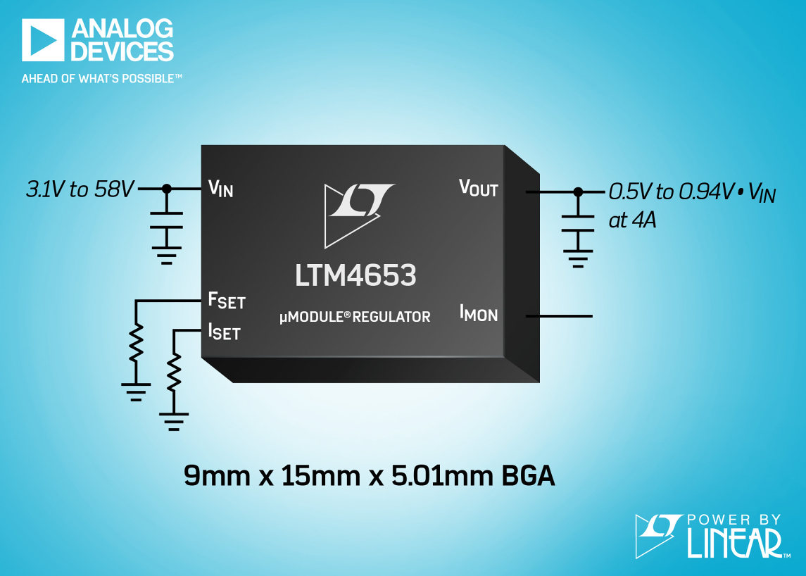 中国北京– 2018 年 5 月 4 日 – Analog Devices, Inc. (ADI) 宣布推出 Power by Linear™ LTM4653,这是一款 58VIN 降压型 µModule® 稳压器。在工厂自动化、工业机器人、通信基础设施和航空电子系统等噪声环境中,它能采用未调整或波动的 24V 至 48V 输入电源安全地工作。LTM4653 将输入和输出滤波器集成在一个封装中,因而能够满足针对信息技术设备的 EN55022 Class B EMC 标准要求。低 EMI 架构使其适合信号处理应用,包括测试和测量、成像及 RF 系统。LTM4653 具有与 LTM4651 58VIN、4A 负输出 µModule 稳压器相同的架构,因此 LTM4651 与 LTM4653 的组合非常适合在系统中产生一对正负电压。
