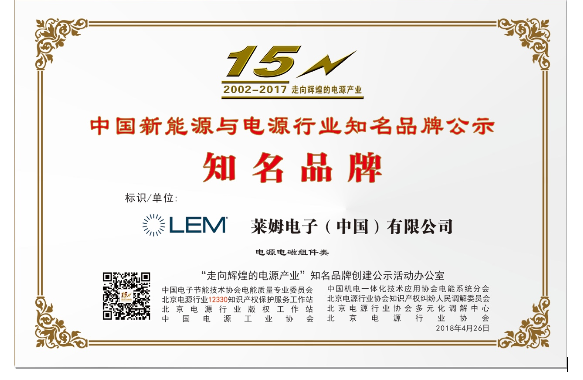 莱姆电子荣获中国新能源与电源行业知名品牌公示知名品牌奖