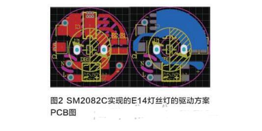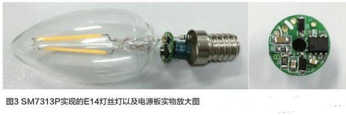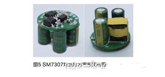 图5是SM7307实现的灯丝灯方案实物图,直径为19mm,认证与非认证兼容,采用EE8.3小电感,可支持6W以下的多种规格应用150V/35mA,60V/60mA,60V/80mA等。