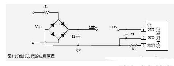 SM2082C是单通道LED线性恒流驱动控制芯片,输出电流由外接电阻设置为5mA~60mA,且输出电流不随芯片OUT 端口电压而变化,系统结构简单,外围元件少,方案成本低。灯丝灯方案的应用原理(图1):