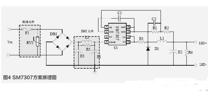 SM7315P与SM7307都是非隔离BUCK LED恒流驱动控制芯片。采用高压自启动及供电技术,不需要辅助绕组提供电源,无需任何的补偿元件,即可实现恒定的输出电流。外围元件少,方案成本低,SM7307的方案原理图如图4。