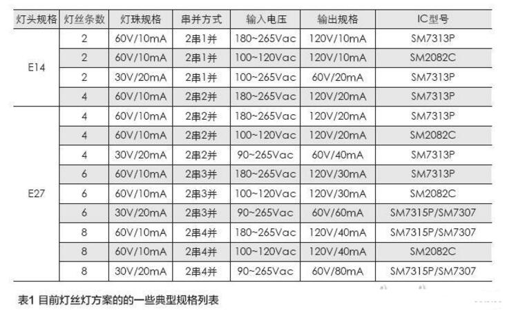 目前灯丝灯方案的的一些典型规格列表如表1: