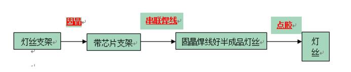 LED灯丝是将无背镀的蓝光LED灯珠固晶在蓝宝石、透明陶瓷、荧光晶体、玻璃、金属等做成的基条上,再通过金线串联,以及涂覆荧光粉而制成[3]。其流程如下图所示。