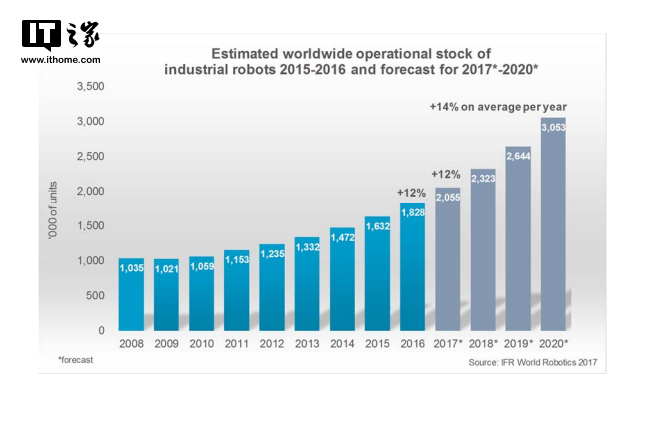 根据2016年的数据,中国、韩国、日本、美国和德国五大国家占据了机器人市场74%的份额。报告预计,中国仍将是机器人行业的主要推动力。