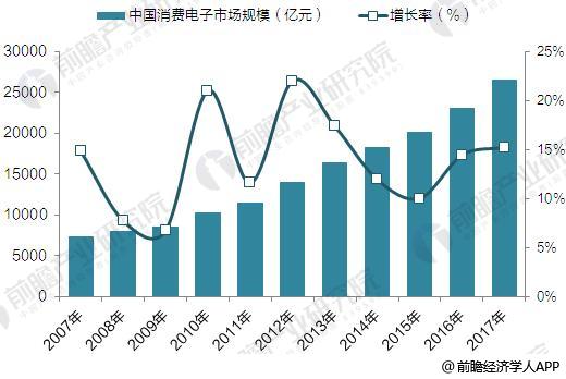图表3:2007-2017年中国消费电子市场规模(单位:亿元)