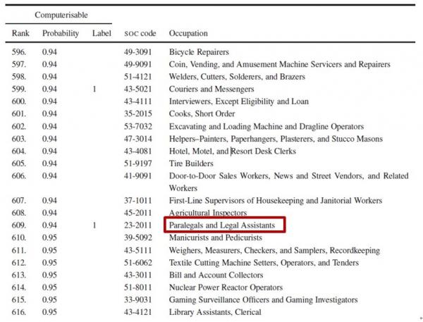 牛津大学Carl Benedikt Frey和Michael A. Osborne教授曾发布了一篇报告:《The Future ofEmployment:How Susceptible Are Jobs to Computerisation》,报告表明,律师助理被替代率是94%,律师秘书到达98%,法官被替代率是40%,而律师仅为3.5%。