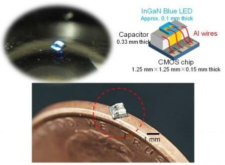 该器件的体积仅为1 mm3、仅重2.3 mg,几乎比任何其他报道的类似器件小一个数量级,因而Tokuda团队称其为“世界上最小的无线光学神经刺激器”。
