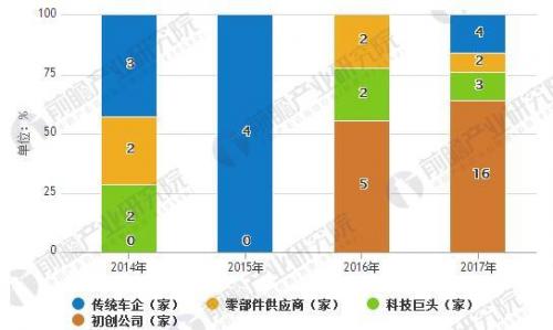 2014/15 年获得许可的公司中均无初创公司;2016 年初创公司5 家,占比56%;2017 年至今初创公司16 家,占比64%,呈现高速增长态势。作为行业新进入者,初创公司轻装上阵,有望实现跨越式发展。我们判断,初创公司有望凭借各自优势,在无人驾驶整车制造、运营、系统解决方案或关键零部件等领域获得重要地位。
