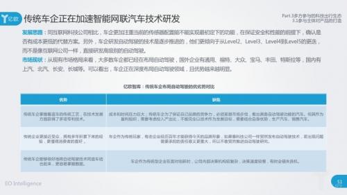 回归到全球智能网联汽车发展状况研究,亿欧智库对全球主流车企对于智能网联汽车的研究进行了盘点: