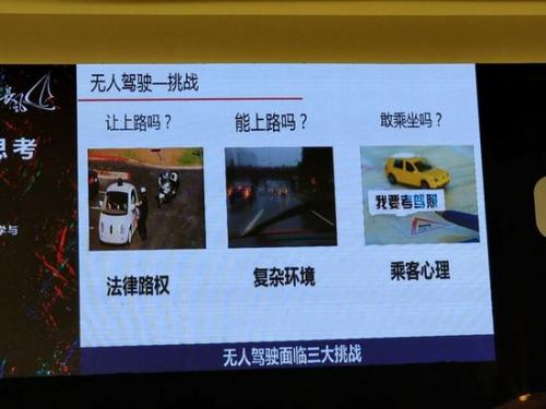 第二个挑战是自动驾驶有没有能力上路。路上的环境很复杂,比如下雨、下雪,基本上人开车都看不见,真正的无人驾驶能适应这些情况吗?