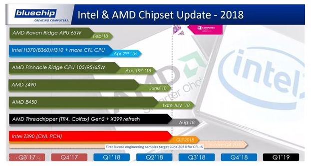 目前国外电商BlueChip在网上曝光了一份AMD以及Intel的全新的芯片组的计划表,当然这些芯片组的计划是包含在自家制作的新PPT上面。根据BlueChip提供的PPT,AMD的Z490芯片组将会在6月正式公布,而B450芯片组的发售时间为7月底,和X370芯片组不同的是,Z490芯片组主要改进在于多了几条PCI-E通道。