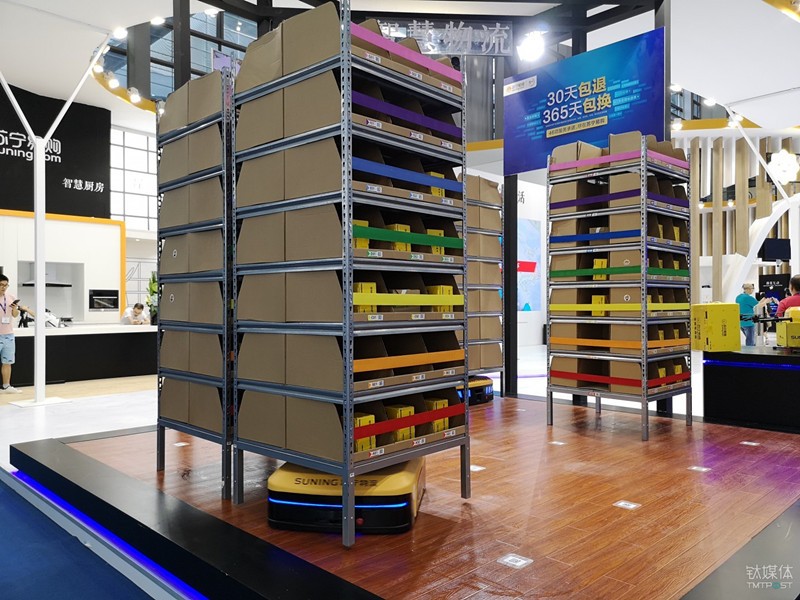 在2018年5月3号深圳开幕的CE China展会上,苏宁易购把他们的物流AGV机器人工作场景搬到了现场。这种物流AGV机器人可以大幅度的降低物流仓库中的人力配备。
