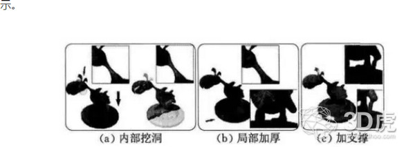 针对强度问题,文献给出了一个自动检测并修正结构强度问题的系统方案,来创建一个新的3D模型,使其与原有模型保持尽可能相近的外形,同时提高其结构强度与整体性。该方案中,模型的结构强度问题通过一个轻量级的结构分析解算器来计算识别出。随后,根据所检测出的强度问题,文中给出三种方法对原模型进行修正:内部挖洞、局部加厚与加支撑,如图10所示。