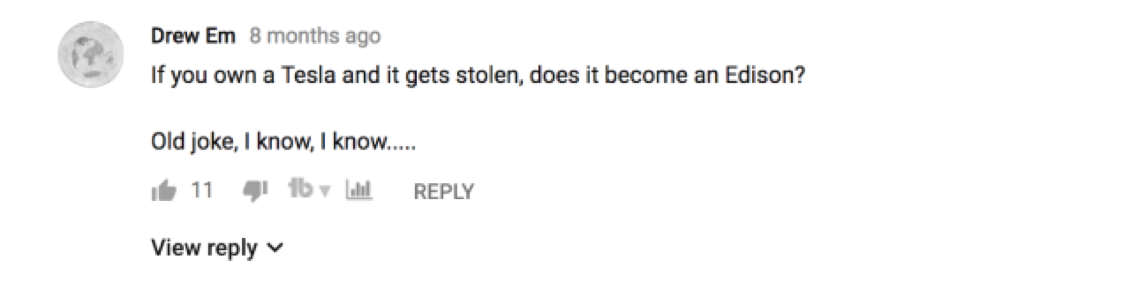 网友Drew Em:如果你的一台Tesla被偷了,它自己会不会变成爱迪生啊?哈哈这是个很老的笑话了,真的很老!