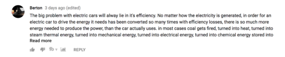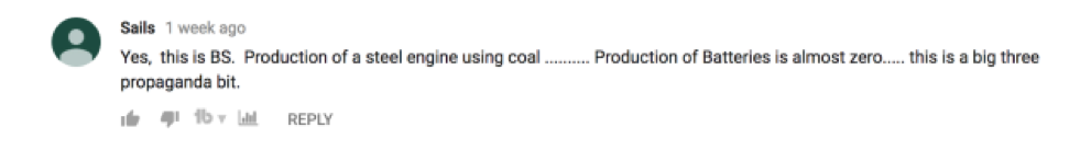 网友Sails:没错,这简直就是扯淡!造发动机要使用煤矿燃料,而造电池和电动机就不要燃烧煤矿了……这简直就是谬论!