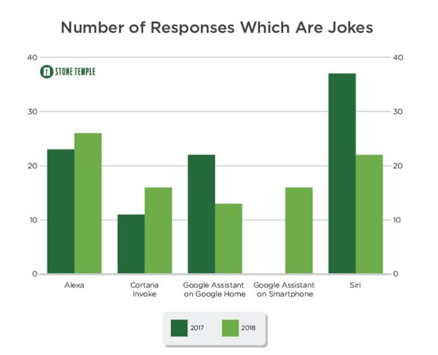 说实话,将近七年过去了,Siri的表现如此之差真令人感到尴尬,因为在Stone Temple的测试报告中,Siri只有“讲笑话”的能力是最强的。在所有关于讲笑话的问题中,2017年Siri是最能讲笑话的,即便到了2018年也依旧不逊色(如下图)。然而,相信用户需要不是只会讲笑话的语音智能助理。