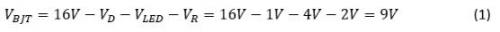 要分析图1中的原理图的散热问题,请思考一个实例,,CHMSL LED的总电流为90mA,因此每个LED串均以45mA电流驱动。 使用16V电源电压,由公式1计算得BJT上的最大压降为9V: