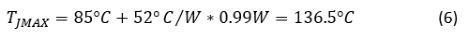 假设IC具有相同的90mA电流,IC上的最大电压降为11V,热阻为52°C / W,则等式6计算最大结温: