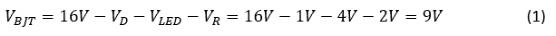 要分析图1中的原理图的散热问题,请思考一个实例,,CHMSL LED的总电流为90mA,因此每个LED串均以45mA电流驱动。 使用16V电源电压,由公式1计算得BJT上的最大压降为9V: