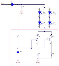 设计人员通常使用分立的电阻和低端双极结型晶体管(BJT)来实现CHMSL模块里基于分立元器件的LED驱动器电路。图1展示了一个用于CHMSL的分立LED驱动电路例子。 在该电路中,CHMSL由两个LED串组成,其中每个串都建立在两个串联的红色LED之上。 BJT位于LED的下侧。