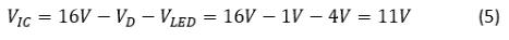 让我们来看看这种设计中的散热性问题。具体来讲就是IC的结温。在16V电源电压下,公式5计算IC上最大压降为11V: