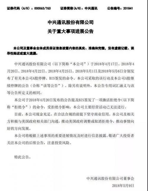 一是,中兴昨晚发表公告,表示主营活动已经无法进行。中兴还称公司现金充足,在合法合规的前提下坚守商业信用。公司及相关方积极与美国政府相关部门沟通,推动美国政府调整或取消拒绝令。