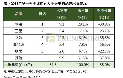 排名第二的三星,第一季平板出货为537万台,季衰退23.7%。虽然三星积极发展商务市场以及高端AMOLED平板,但高端产品在数量上较难提升,因此三星第一季市占表现由去年同期的19.1%下滑至17.1%。