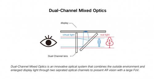 这看似简单的镜片里却包含了复杂的多层光学结构,可以使得虚拟光线和真实光线可以同时穿过眼前的垂直双通道镜片,从而实现大视角显示。这种解决方案,可使其视场角高达 96 度。