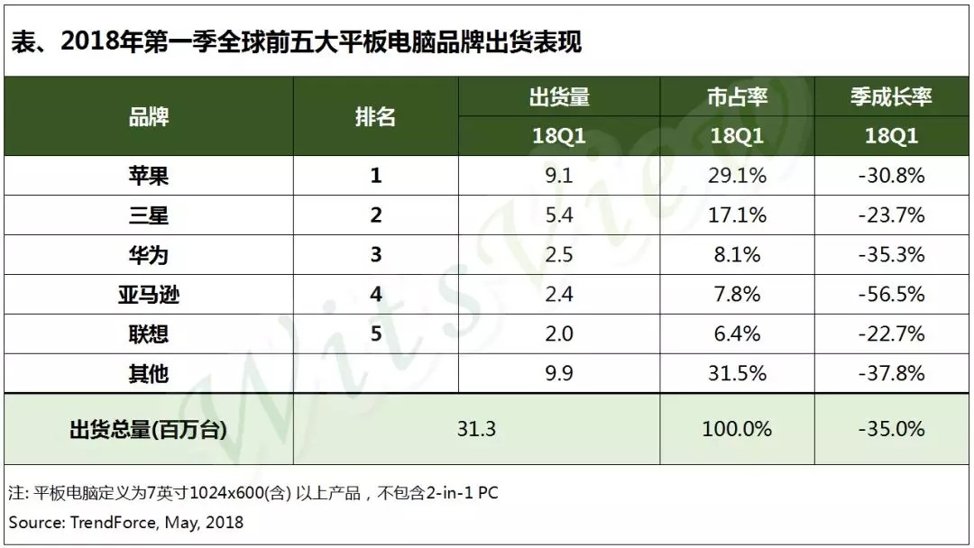 2018年Q1平板电脑市场排名:苹果/三星/华为居前三