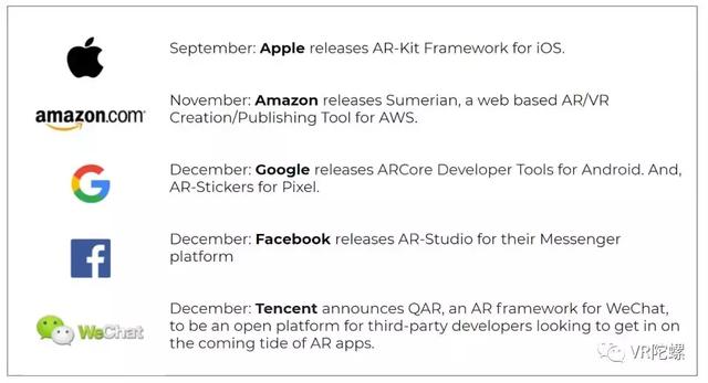 在2017年底,我们看到几家世界500强级别的巨头公司已经投资了这个重要的平台。谷歌和苹果发布了MR开发工具(ARKit和ARCore),亚马逊发布了基于网络的MR创作工具Sumerian,Facebook为其Messenger平台发布了AR Studio,腾讯宣布了微信AR框架QAR。此外,根据Deloitte LLP在2017年4月发布的内部分析,世界财富500强中有52家公司正在测试或部署AR/VR产品或解决方案。