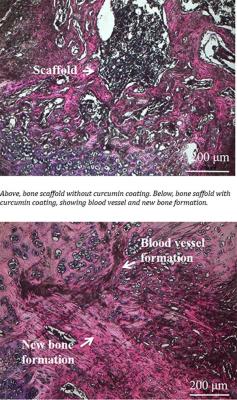 研究人员从姜黄中提取天然成分来刺激骨骼生产。他们将姜黄素包裹在亲水的大分子聚合物中,随着时间推移,姜黄素会逐渐从陶瓷支架中释放出来。涂覆有这种有机化合物的3D打印支架可以增加支架周围组中新骨细胞和血管的活性与增值,从而加速愈合过程。