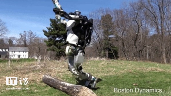 视频中的机器人看起来更加自然,在一个视频中,人形机器人Atlas在一个崎岖不平的草地上慢跑,当它遇到一块朽木时,还调整姿势跳了过去,并且姿势也比较自然。