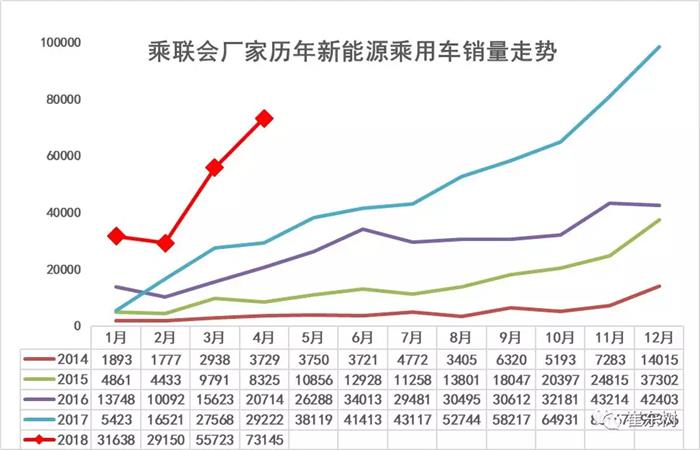 进入2018年,随着补贴政策的调整,新能源车的增长动力从限购+补贴政策推动逐步向市场拉动转型。这为新能源汽车的发展带来不确定性,然而,整个新能源车市场却表现出了很好适应性。第一季度,新能源车的销量为11.65万台,同比增长113%,呈现开门红的喜人态势。4月新能源车的销量增势依旧强劲,达到73145台,同比陡增150%。