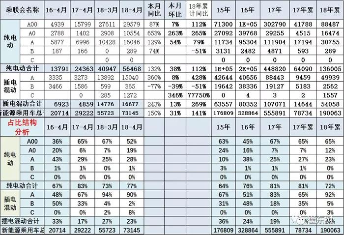 其中,面临补贴大幅降低压力下的A00级纯电动车,4月销量为29579台,同比增长87%,以52%的市场份额占据绝对主力,但市场份额明显减少。