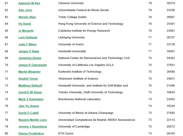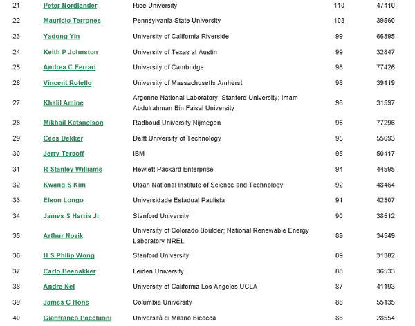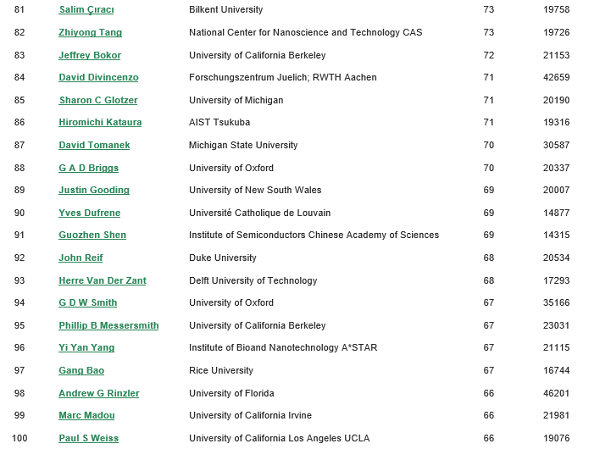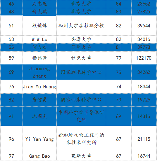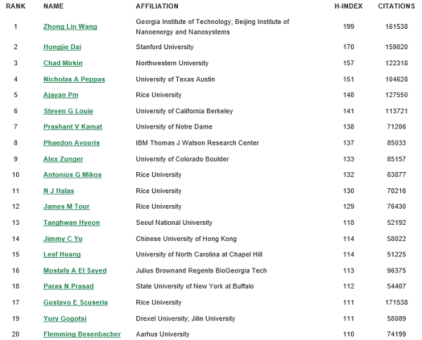 值得一提的是,王中林院士在之前的总排名中位列全球第35,h-指数206,引用次数171900。王中林教授致力于氧化锌纳米结构的研究,其关于氧化锌的发现成为十年来世界在材料领域引用最多的论文之一,单篇引用达3200次,被国际科学引文机构(ISI)在2003年发表的世界纳米科技进展总评中列为两个重点报道之一。近年来,王中林组致力于蓝色能源,发表了多篇举世瞩目的成果,目前为止王中林教授已经发表了十几篇N/S文章,其创办的国际著名期刊Nano Energy,影响因子也已经高达12.343。而来自北京大学的刘忠范和俞大鹏院士,近年来的研究成果也是多有突破,刘忠范主要从事低维材料与纳米器件、分子自组装以及电化学研究。其发展了纳米碳材料的化学气相沉积生长方法学,建立了精确调控碳纳米管、石墨烯等碳材料结构的系列生长方法,发明了碳基催化剂、二元合金催化剂等新型生长催化剂,提出了新的碳纳米管“气-固”生长模型;将有机小分子的自组装概念拓展到准一维碳纳米管领域,建立了多种化学自组装方法,并开拓了自组装膜电化学和基于扫描探针显微技术的针尖化学研究方法。俞大鹏在半导体纳米线制备与物性研究方面做出了一系列开创性和系统深入的研究工作,尤其是利用简单热蒸发方法制备硅纳米线、氧化物纳米线方面已引起国内外同行的重视,形成了较广泛的影响。另外,俞大鹏除了是北京大学教授以外,几年前加入了对中国高校发展具有里程碑意义的南方科技大学,探索全新的发展道路。