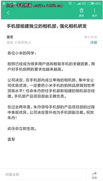 同时,雷军也任命原手机部产品项目部负责人朱丹为相机部总经理,并晋升为手机部副总裁,其原职位将有王腾接任。