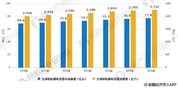 2010-2016年全球铝电解电容器市场规模、消费量走势图