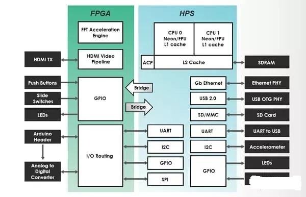 大部分低级I / O端口通过FPGA进行控制和连接,这就降低了CPU等待低级别I/O端口的时间,同时也允许数据在传递到HPS之前进行相应的处理或调整。