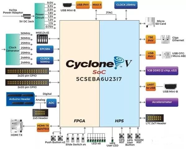图1:Terasic DE10 Nano Cyclone V FPGA和硬件处理器系统(HPS)的接口布局。