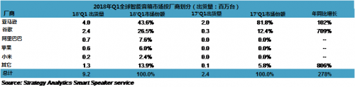 Strategy Analytics总监David Watkins评论道:“2018年Q1亚马逊和谷歌全球出货量份额总计达到70%,尽管它们的总计份额与2017年Q4的84%和2017年Q1的94%相比有所下降。部分原因是由于中国市场的强劲增长,而亚马逊和谷歌目前仍缺席中国的智能音箱市场。 阿里巴巴和小米在中国领先,仅靠中国国内市场的实力就足以推动它们晋升全球前五。”