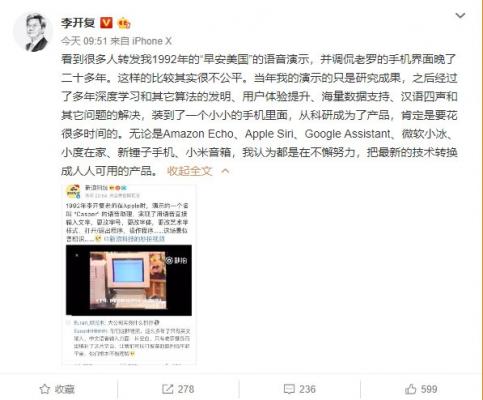 今天上午,李开复现身微博进行了回应。他表示,这样的比较其实很不公平。“当年我的演示的只是研究成果,之后经过了多年深度学习和其它算法的发明、用户体验提升、海量数据支持、汉语四声和其它问题的解决,装到了一个小小的手机里面,从科研成为了产品,肯定是要花很多时间的。”