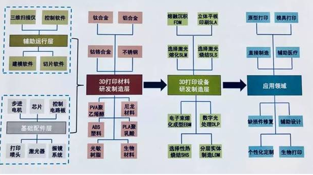 3D打印产业链,主要包括基础配件、辅助运行、3D打印材料、3D打印设备和产品应用5个环节。